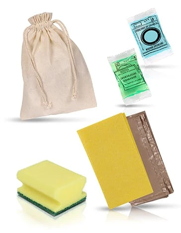 Inhalt: Die Bestellung umfasst 50 Reinigungssets. Jede Packung enthält: 1 gelben Putzlappen, 1 gelben Putzschwamm, 1 Bio Handseife 10gr, 1 Flasche Geschirrspülmittel Bio 30ml & 1 Mülltüte.