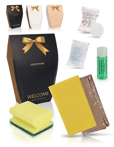 Inhalt: Jede Box besteht aus 6 wesentlichen Reinigungsutensilien in der Küche: 1 gelben Putzlappen, 1 gelben Putzschwamm, 1 Flasche Geschirrspülmittel 30ml, 1 Spülmaschinentab, 1 Waschmaschinentab & 1 Mülltüte.